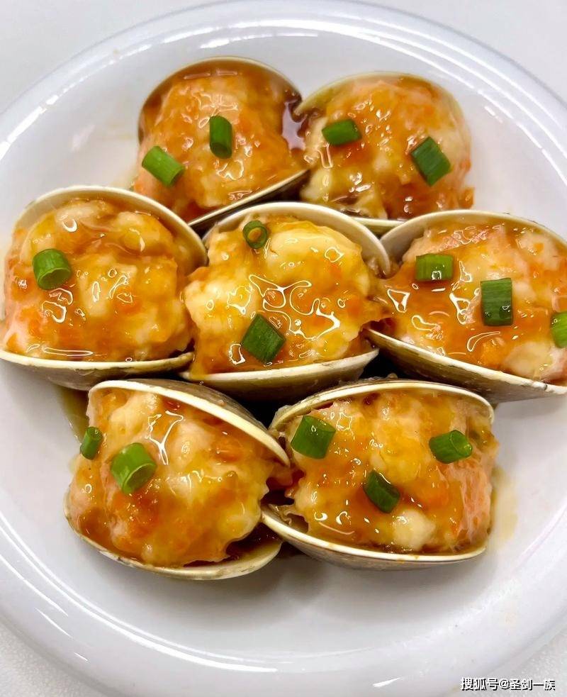 2. 将虾滑填入花蛤内,摆入盘中。水沸后上锅蒸10分钟。