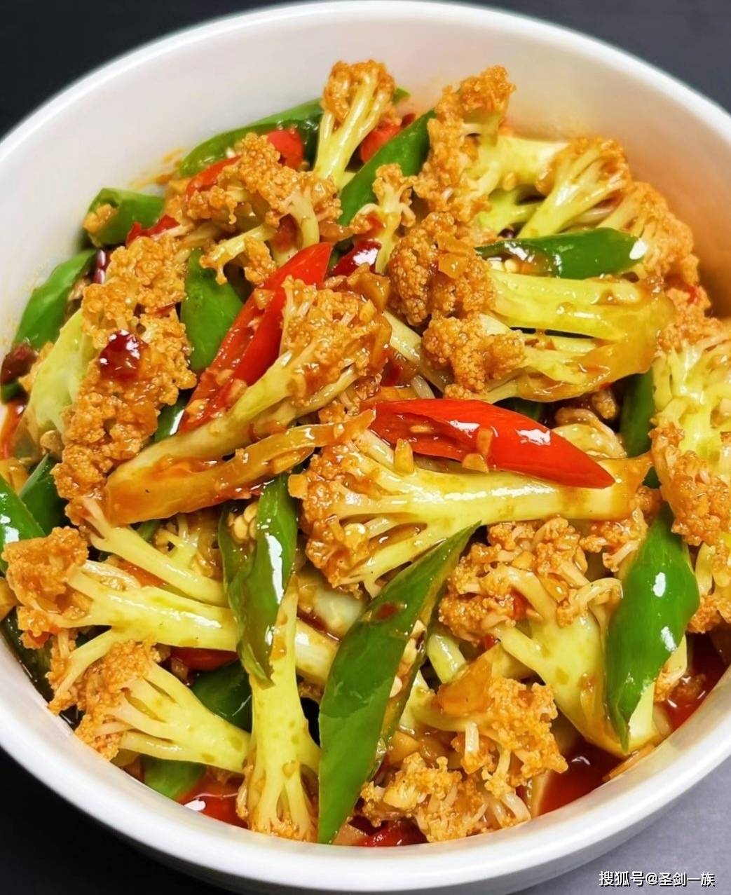 3. 锅烧到冒烟,倒少许油,下花菜大火煸炒3分钟,边缘微焦盛出。