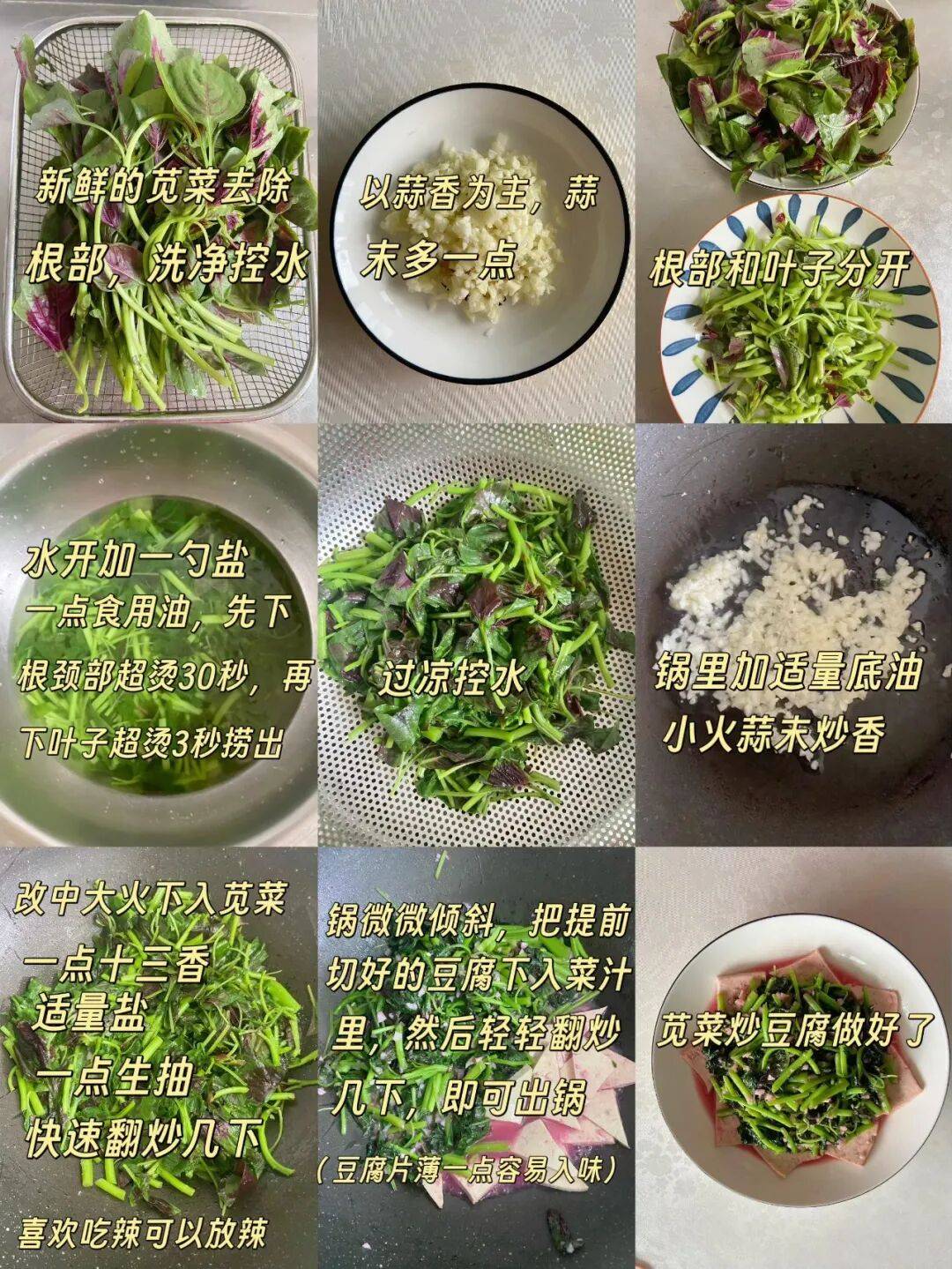 小贴士:豆腐切薄一点更易入味,翻炒时动作要轻,避免豆腐碎掉;苋菜焯水时加盐和油,能保持翠绿的颜色;全程大火快炒,锁住苋菜的水分和鲜味。