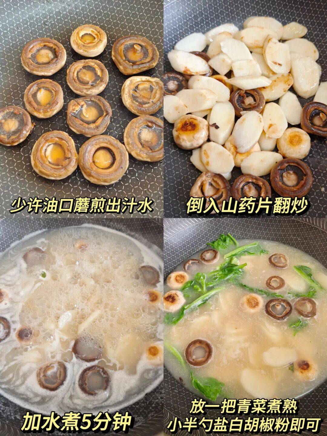 小贴士:山药去皮时最好戴手套,避免黏液刺激皮肤发痒;口蘑不用炒太久,炒出汁水就可以加水,不然会发老;白胡椒粉少放一点,能提鲜还能驱寒。