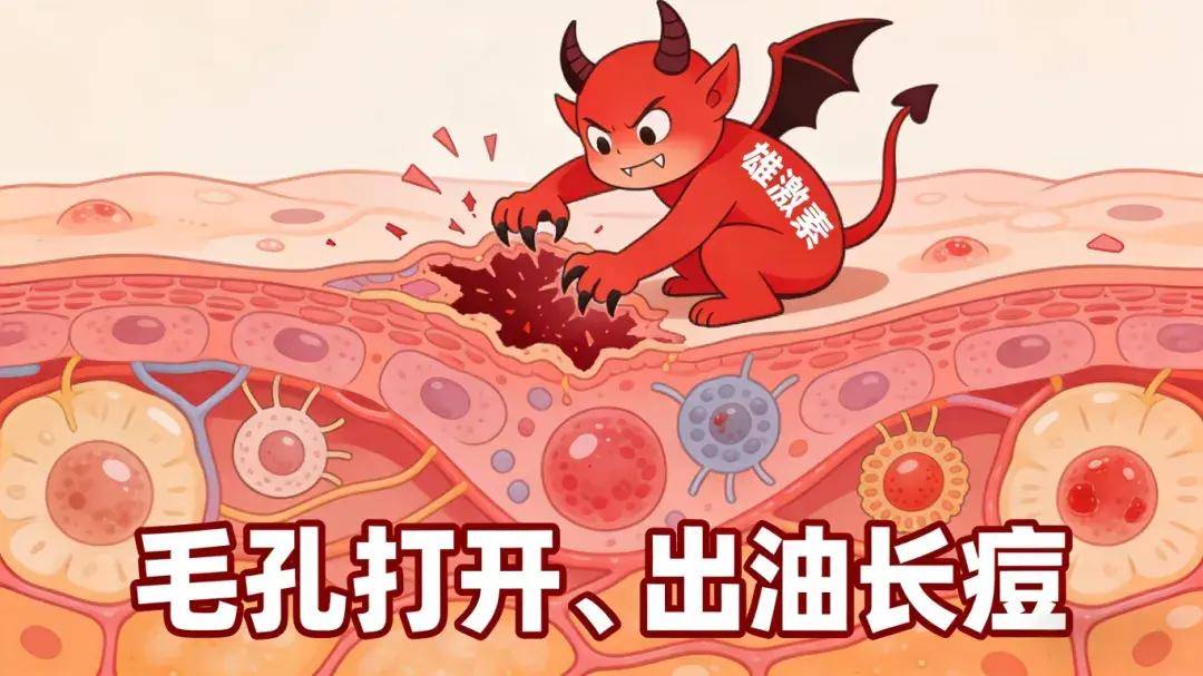 雄激素却是水嫩细致皮肤的克星,雄激素可促进皮脂腺细胞的增殖和分化,使得皮脂腺分泌增加,促进角质化;由于皮脂腺分泌亢进,导致皮脂腺开口扩张,毛孔增大。