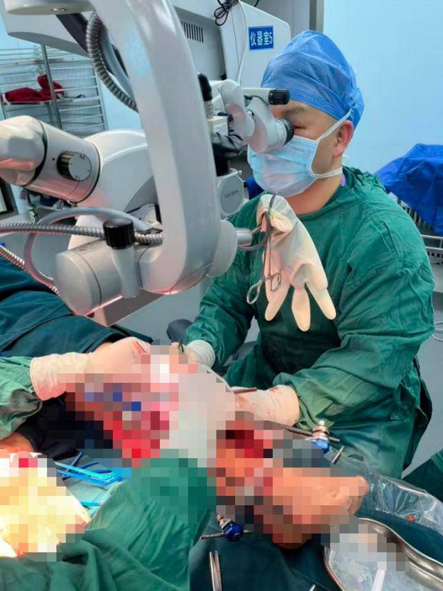 (手足显微外科团队在显微镜下为患者进行血管移植)