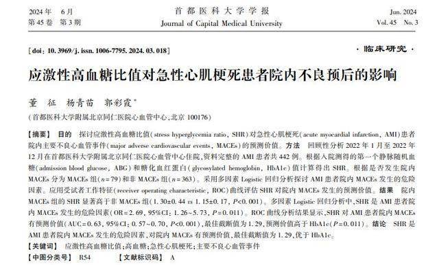 [1]董征.应激性高血糖比值对急性心肌梗死患者院内不良预后的影响,首都医科大学学报, 2024-05-29