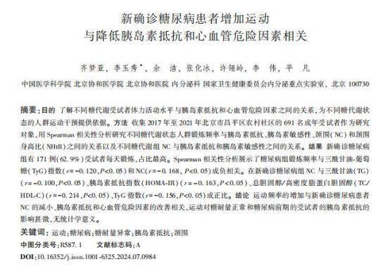 [1]齐梦亚.新确诊糖尿病患者增加运动与降低胰岛素抵抗和心血管危险因素相关,基础医学与临床,2024-06-28