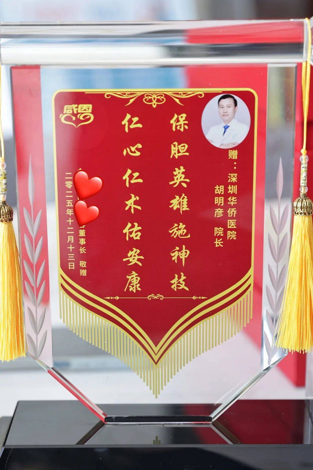 近日,深圳某企业董事长张女士(化名)专程来到深圳华侨医院,将一面印着“保胆英雄施神技,仁心仁术佑安康”的水晶锦旗送到胡明彦院长手中,以此感谢胡院长团队凭借精湛的微创保胆取石技术,为其成功保住胆囊、解除病痛,在术后一个月的复查中,她的身体恢复状况远超预期。