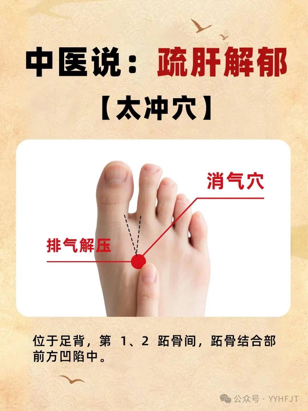 遇到烦心事,可以试试按摩太冲穴——就在脚背上,大脚趾和二脚趾骨头缝中间。边按边吐气,能帮助撒撒肝火。