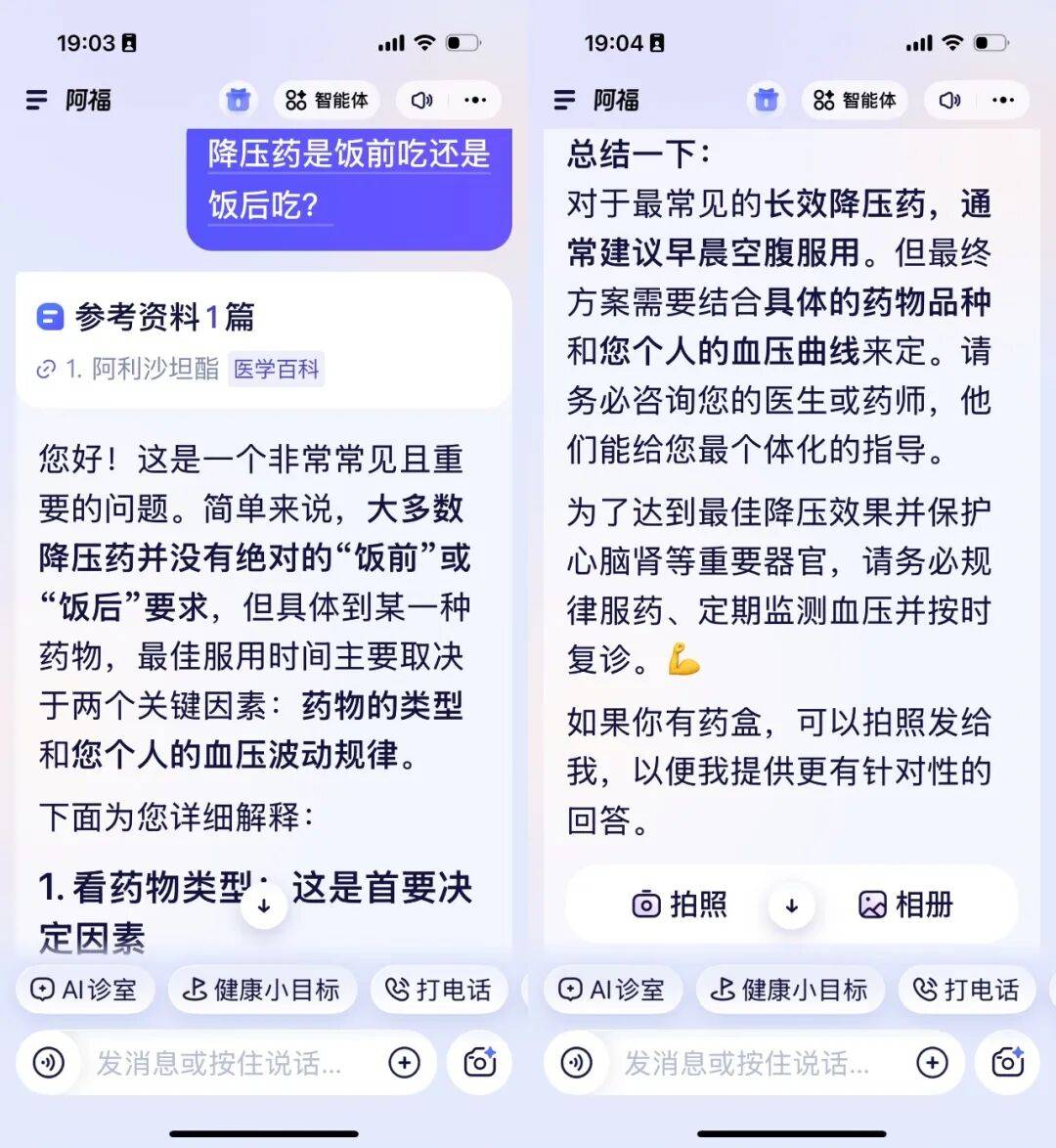 父亲将信将疑,按下按钮问:“降压药是饭前吃还是饭后吃?”一段清晰温和的声音响起,阿福像一位老朋友一样,一字一句解答他的疑惑。阿福追问,“你正在服用的是哪款降压药?”在父亲回答后,阿福提醒他添加用药计划,“让我提醒你按时用药。”