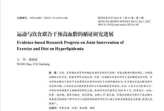[1]王 华,蔡国梁.运动与饮食联合干预高血脂的循证研究进展,四川体育科学,2022