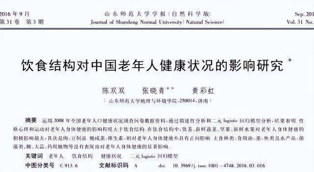 [1]陈双双.饮食结构对中国老年人健康状况的影响研究, 山东师范大学学报(自然科学版), 2016-09-15.