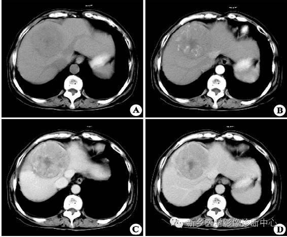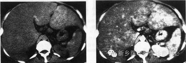 (3)增强扫描呈轻度到明显强化,密度可高于周围肝组织,亦可低于正常肝组织。延迟扫描病灶呈等密度或低密度。