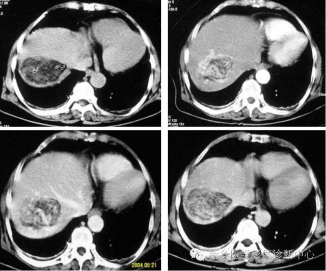 CT诊断要点:平时呈低密度肿块灶,境界多较清楚。增强扫描早期病变示边缘强化,随着时间的延伸,强化逐渐向中心扩张,仍为低密度。表现与海绵状血管瘤相似,但与之相比,肿瘤染色、增强更为显著,内部结构形态更为复杂,并可为多发性病变,弥漫性侵及全肝。且有恶性征象。