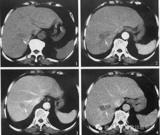 CT诊断要点:平扫呈边界清楚的低密度灶。增强扫描动脉期明显均匀强化。门脉期高或者等密度,延时期为低密度。少部分病例始终不强化,表现为低密度灶。