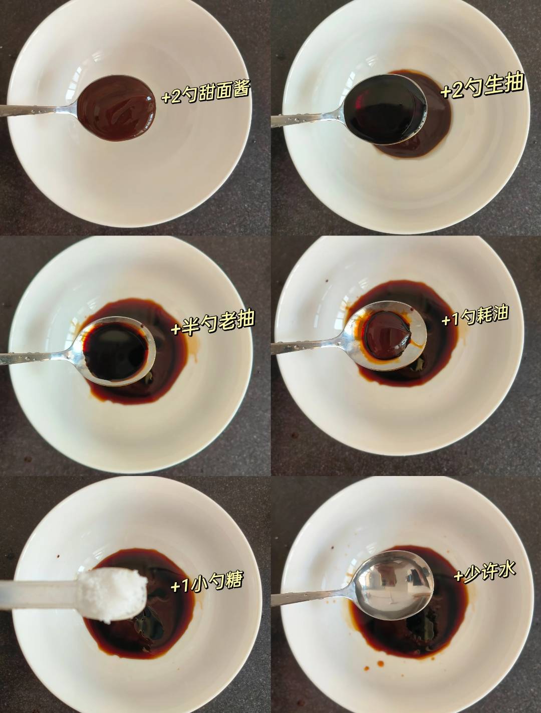接下来是烹饪的核心环节——炒制酱汁肉丝。提前调好一碗灵魂料汁:碗中放入两勺甜面酱、两勺生抽、半勺老抽上色、一勺蚝油、一小勺糖,再加少许水搅拌均匀。