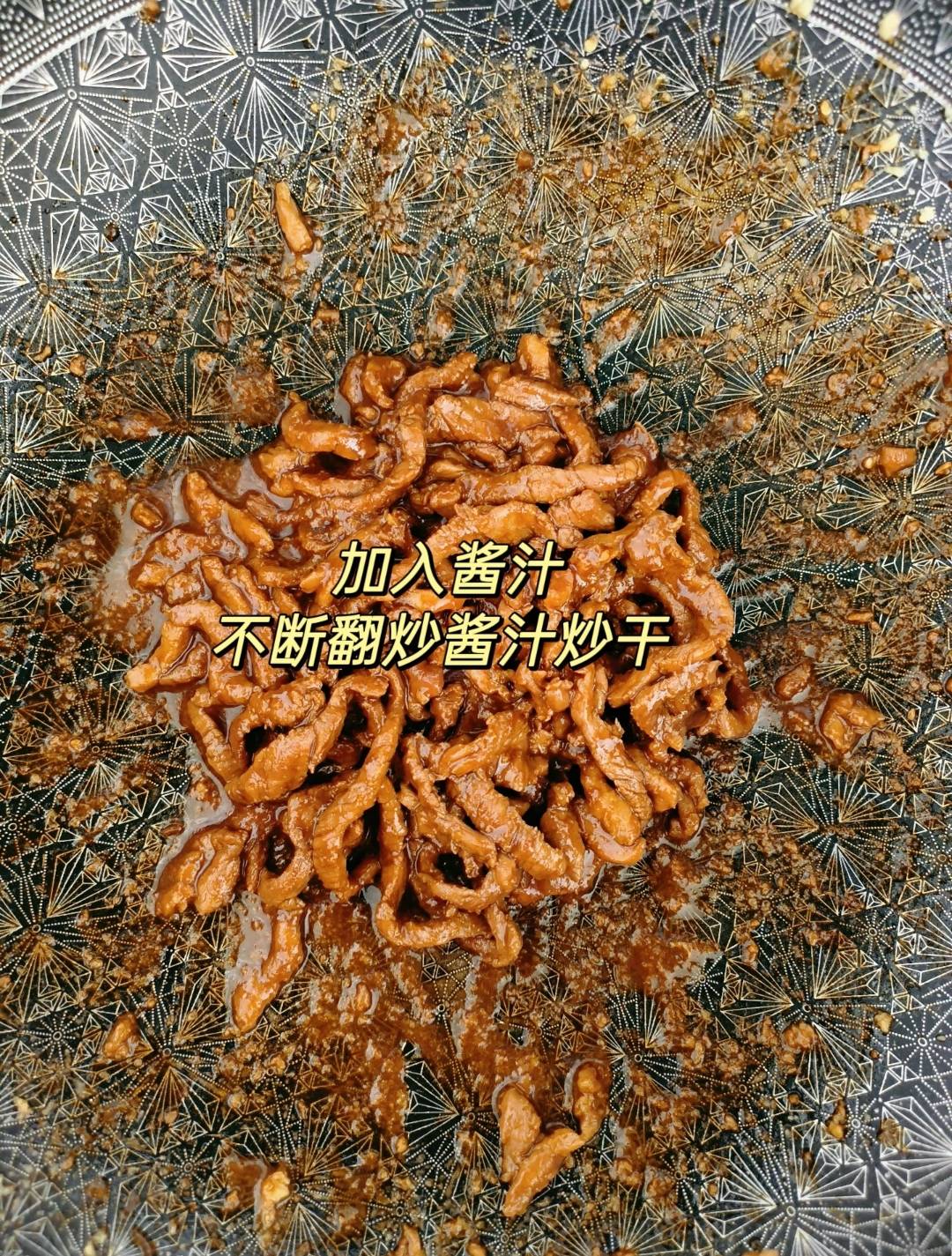 锅中热油,倒入腌制好的肉丝快速滑散,待肉丝变色发白后,倒入调好的料汁。此时需不断翻炒,让料汁均匀包裹每一根肉丝,随着火力的加热,料汁逐渐炒干,变得浓稠油亮,酱香四溢。出锅前撒上一把白芝麻,既增添了香气,又点缀了色泽。