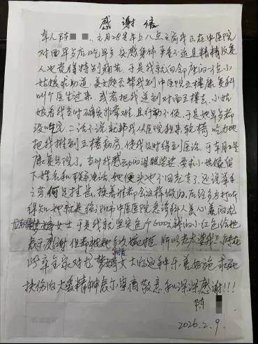 这份真诚又坚定的推却,让老人愈发感动。此后,陈奶奶三次和家人一起来到医院,送来亲手写的感谢信。“你连早饭都没吃就来帮我,这份情,我一辈子都记得。”龙朝霞被说得有些不好意思:“其实真的没什么,遇到这样的事,我们医护人员都会伸手的。”