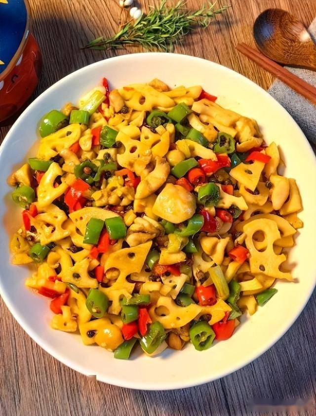 7. 翻炒片刻后,即可关火出锅,一道营养丰富的青椒鸡肉炒藕丁就完成了。