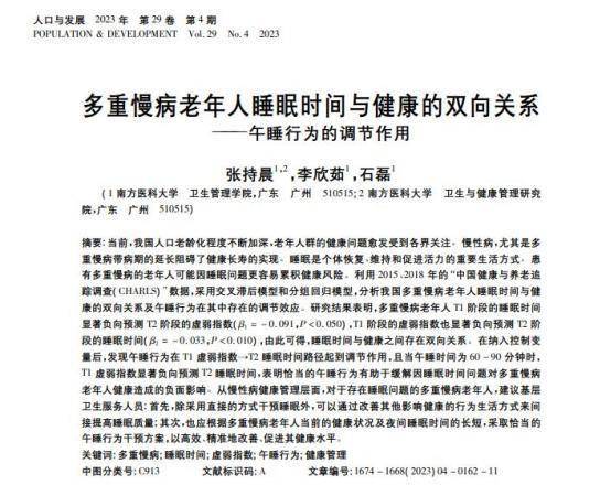 [1]张持晨.多重慢病老年人睡眠时间与健康的双向关系——午睡行为的调节作用, 人口与发展, 2023-07-29