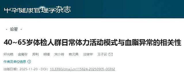2025年11月,《中华健康管理学杂志》发表的一项最新研究发现,闲暇时进行运动锻炼有助于降低血脂异常风险,其中常做家务的男性,血脂异常风险降低45%,高甘油三酯风险更下降56%!