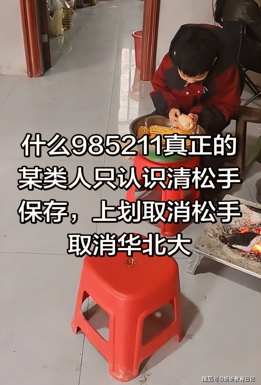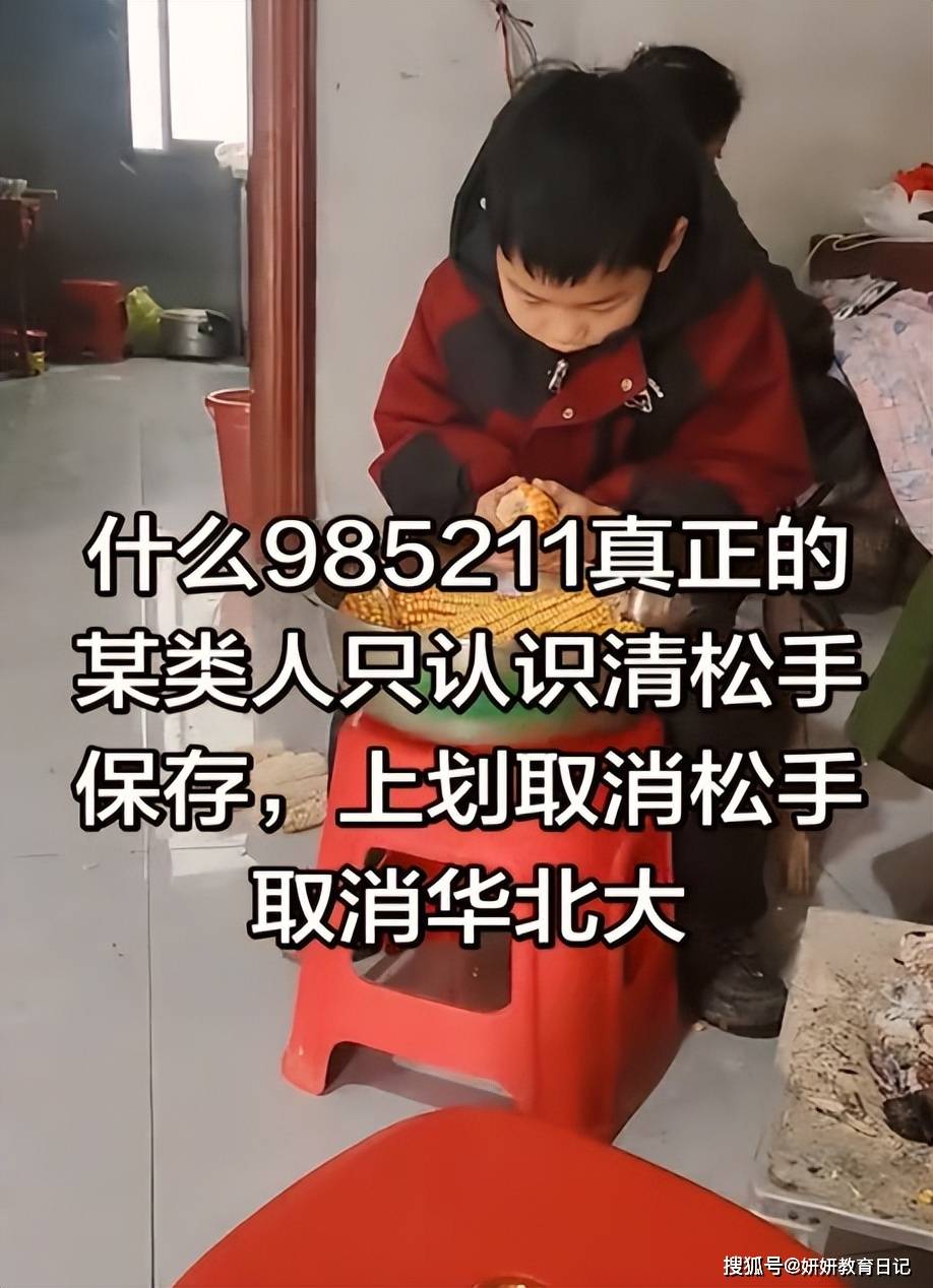 竟然配了一段相当诡异的文字,背景是家里正在上小学的孩子和老人们一起剥苞米,这本来是一个常见的农村场景,可是他配上的文字却是关于985和211的。