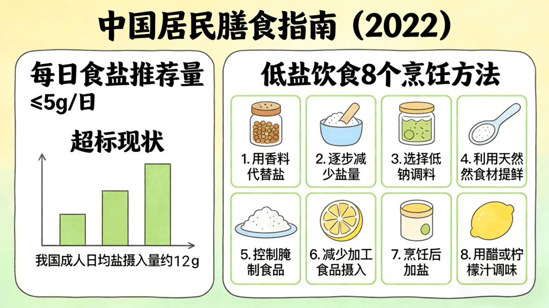 减盐:每天食盐不超过5克(约一个啤酒瓶盖的量),预防高血压和水肿。