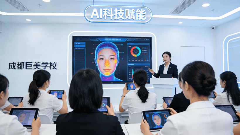 像巨美学校这种引入AI科技赋能教学的,学完你会用AI分析皮肤,客户就会觉得你专业,而不是觉得你是个洗脸妹。