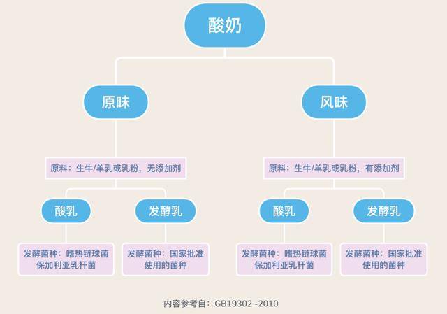要搞明白这个,就得先了解酸奶的分类。我们在超市买到的酸奶,根据发酵剂和食品添加剂不同,可分为四大类:原味酸乳、风味酸乳、原味发酵乳和风味发酵乳。
