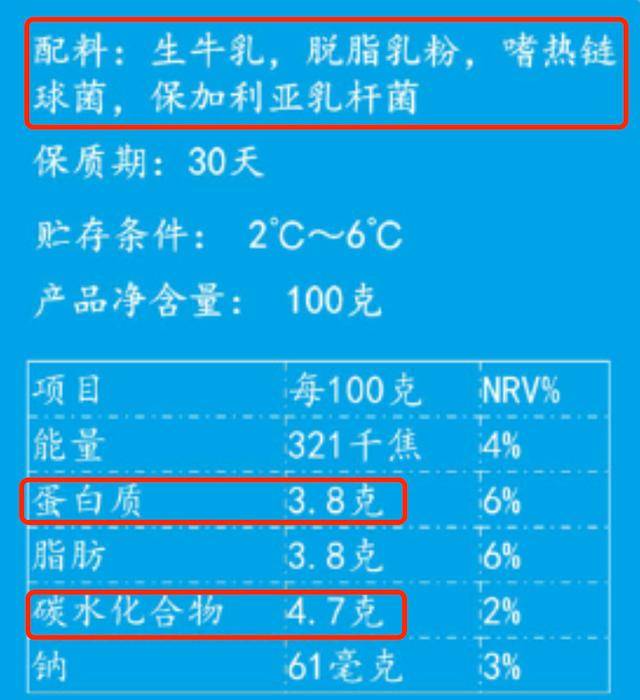 先看蛋白质含量:每 100 g 含有 3.8 g,远高于国家标准:发酵乳的蛋白质的含量应在 2.9% 以上,确认为真酸奶。