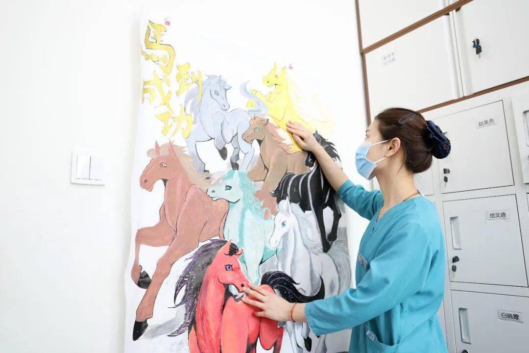 护士们还亲手绘制了一幅《八骏图》,寓意马到功成,祝愿所有患者早日康复、平安顺遂。