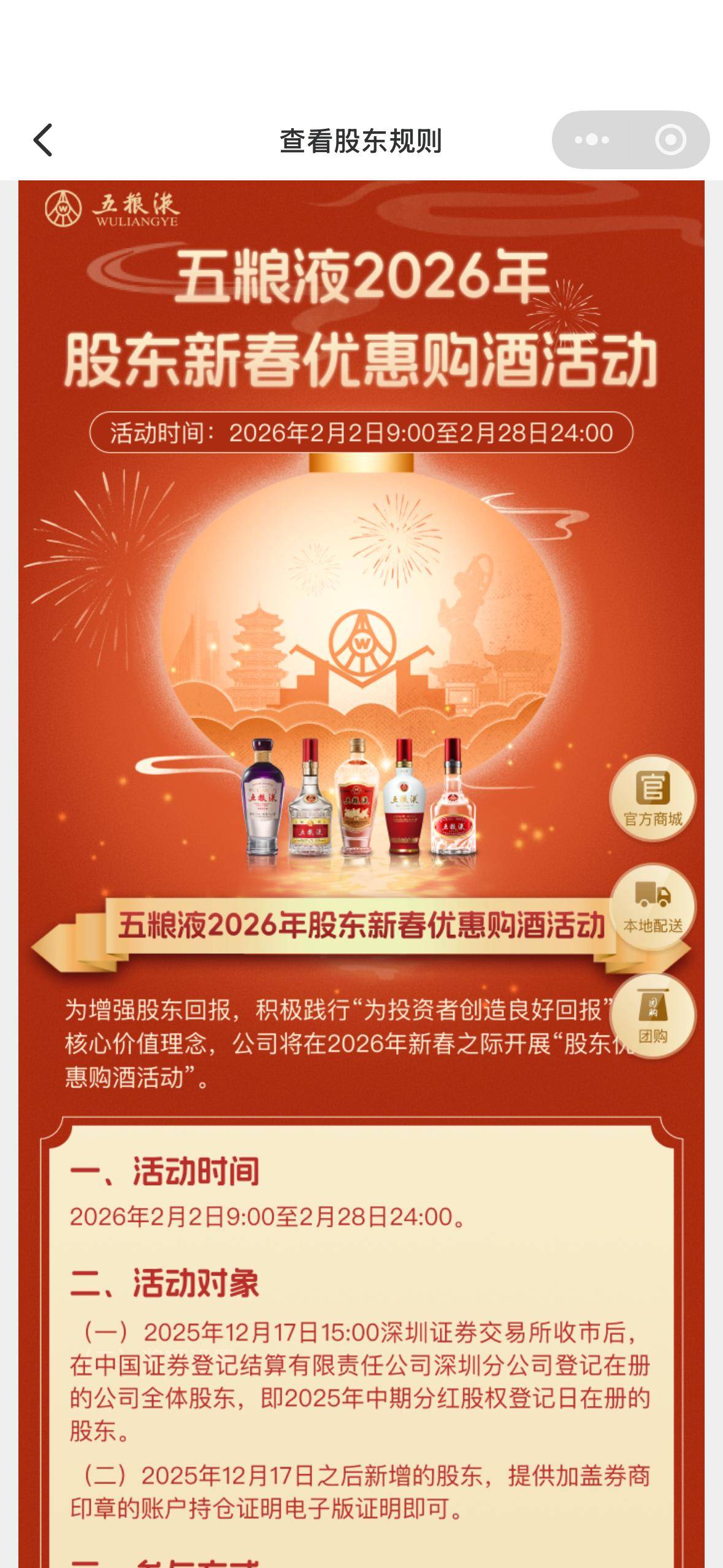 根据活动规则,此次股东新春优惠购酒活动时间为2月2日9时到2月28日24时,活动对象为2025年12月17日15:00深圳证券交易所收市后,在中国证券登记结算有限责任公司深圳分公司登记在册的五粮液全体股东,即2025年中期分红股权登记日在册的股东。2025年12月17日之后新增的股东,提供加盖券商印章的账户持仓证明电子版即可参加活动。