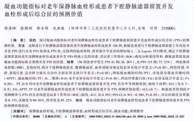 [1]徐苏玲.凝血功能指标对老年深静脉血栓形成患者下腔静脉滤器留置并发血栓形成后综合征的预测价值,中国老年学杂志,2024-06-1