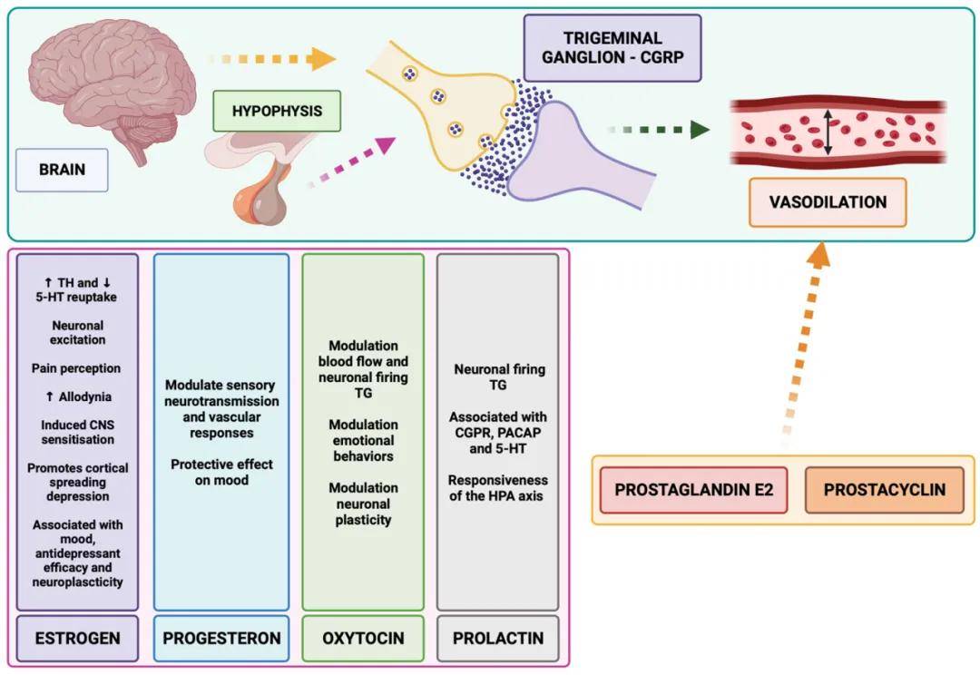性激素,主要是雌激素,与偏头痛和抑郁症有关。性激素的波动会影响女性的健康。雌激素与抗抑郁药的疗效之间存在密切关系,因为雌激素被认为可以促进血清素能信号传导,并与神经可塑性有关。此外,黄体酮是感觉神经传递和血管反应的关键调节剂,特别是在患有偏头痛和抑郁症的女性中。催乳素也是男性和女性偏头痛差异的关键因素,与偏头痛发作和情绪障碍的过程密切相关,可能成为偏头痛和抑郁症合并症的治疗靶点。这些发现的临床意义表明,雌激素状态可能对偏头痛和抑郁症合并症很重要,雌激素治疗或替代作为女性的药理学选择可能值得进一步探索 (图3)。