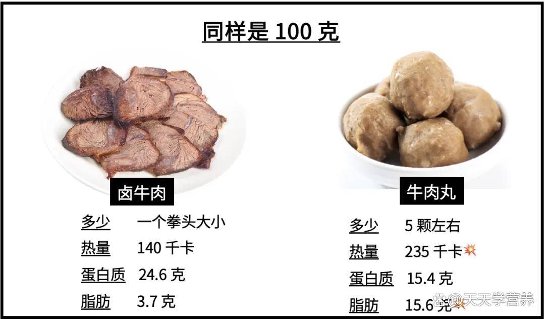 也就是说,同样吃 100 克,吃牛肉丸摄入的热量几乎是卤牛肉的两倍,而得到的优质蛋白却少了近一半。