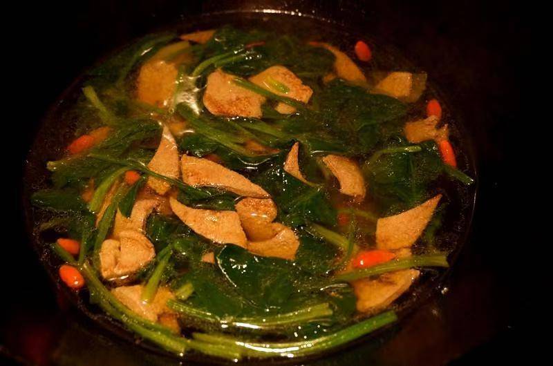 5、在汤汁中调些生抽,盐,菠菜撒进去,再加一小撮红枸杞,汤汁拌匀火后,马上关火。