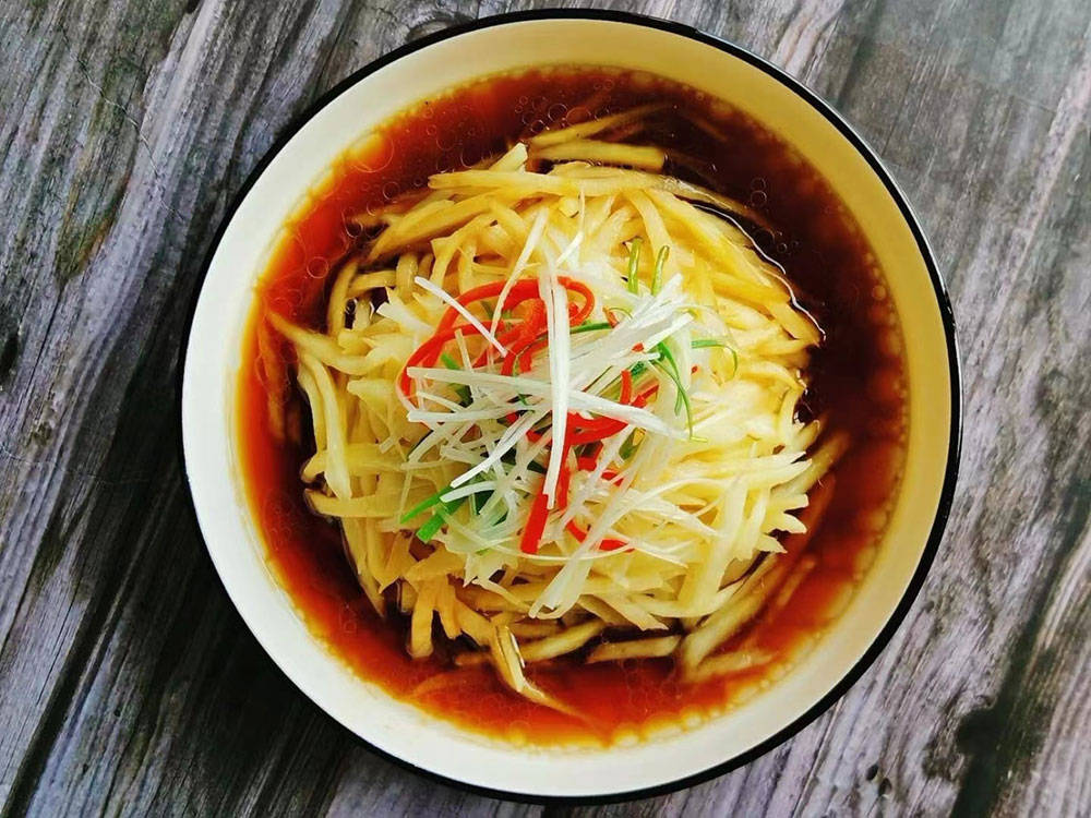 4、其中码上一些葱丝,青红椒丝,淋上生抽,醋,盐,另外少点油,从料头上淋进去,再轻轻拌一拌,就做好了。