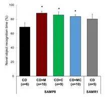 研究人员对2个月大的患有老年痴呆的小鼠分别喂食含绿原酸饮食、含绿原酸+乳脂球膜饮食以及正常饮食,喂食1个月或8个月,并对年轻小鼠和小鼠分别进行记忆力的测试。研究发现,绿原酸和绿原酸+乳脂球膜这两组都能增强记忆力,其中绿原酸+乳脂球膜增强记忆力效果更好。