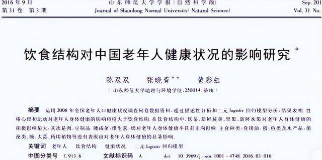 陈双双.饮食结构对中国老年人健康状况的影响研究, 山东师范大学学报(自然科学版), 2016-09-15