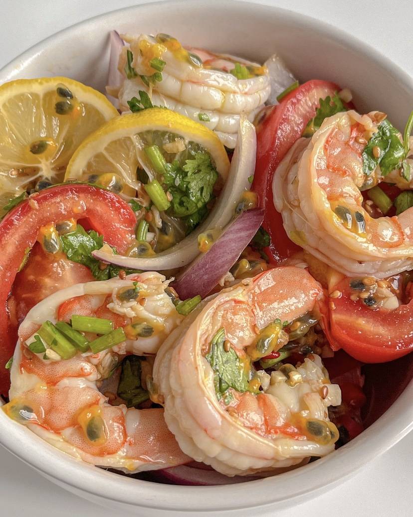 接下来将煮好的虾仁放入大碗中,加入切好的洋葱、番茄、香菜和柠檬片,倒入调好的料汁,再加入百香果果肉,搅拌均匀。百香果的酸甜与料汁的咸香完美融合,渗透进每一口虾肉中,带来层次丰富的味觉体验。番茄的多汁、洋葱的微辣、香菜的清香,再加上柠檬的清新,让这道菜口感丰富,清爽不腻。虾仁富含优质蛋白质,低脂低卡,是减脂期的理想选择,而百香果和柠檬则提供了丰富的维生素C,有助于增强免疫力和促进消化。这道菜不仅适合减脂期食用,也适合作为夏日开胃凉菜或便当。制作时可以根据个人口味调整辣椒和糖的用量,喜欢酸辣口味的可以多加小米辣和柠檬汁,喜欢甜口的可以适当增加白糖。虾仁的选择上,建议选用新鲜的大虾,口感更佳。百香果要选成熟度高的,果肉饱满,香气浓郁。柠檬最好用新鲜的黄柠檬,香气更清新。搅拌时要轻轻翻拌,避免虾仁破碎,保持菜品的美观。