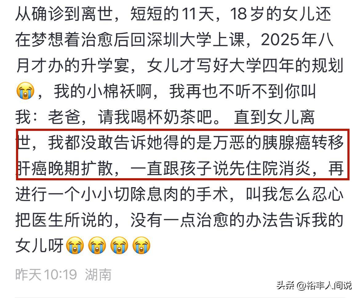 至于诱发胰腺癌的原因,父亲在留言中坦言,这与长期饮食不规律导致的胰腺炎密切相关。她身体不适时,还以为只是减肥的副作用,没想到最终演变成胰腺癌晚期,并迅速转移至肝脏,最终酿成悲剧。人生需要不断进步,追求理想和成就固然重要,但任何努力都必须以身体健康为前提。身体是一切的基础和根本,如果所追求的目标会危害健康,那么必须果断放弃。