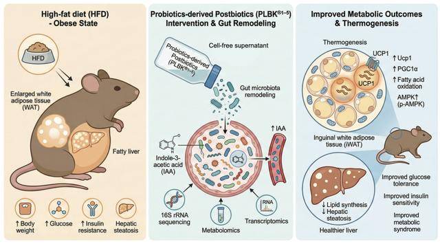 为什么摄入后生元能改善代谢?研究团队通过转录组学分析发现,后生元的功效并非简单作用于肠道局部,而是能系统性上调脂肪组织中与“产热”和脂肪酸氧化相关的关键基因表达,同时下调肝脏中负责脂质合成的基因网络。简单来说,后生元就像给身体下达了一道“代谢重编程”指令,让原本用来“囤积”热量的脂肪,转变为能够“燃烧”消耗热量的状态。