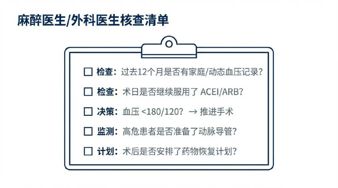 2026年英国麻醉医师协会与英爱高血压学会发布围手术期成人血压管理更新指南,为2016版修订版,适用于择期手术成人(新增心脏、减重手术,排除产科、内分泌手术等),围手术期界定为手术决策至术后30天。指南明确了血压测量的核心阈值:基层近12个月门诊血压<160/100mmHg或居家/动态血压<155/95mmHg可正常转诊,术前评估无基层正常记录时,门诊<180/120mmHg或居家/动态<175/115mmHg方可手术,≥180/120mmHg需推迟手术并管控血压。同时规范管理要点:患者手术当日需继续服用所有降压药(含ACEI、ARB);术中避免持续低血压,高危者以平均动脉压>70mmHg、收缩压>100mmHg为目标,高危人群缩短监测间隔或采用有创监测;术后及时处理高低血压,待血压恢复后个体化重启并调整降压药剂量。该指南契合NICE相关标准,更认可基层/院外血压测量,部分推荐证据等级较低,且基于英国临床实践制定,强调基层与医院的跨科室沟通对保障手术安全的重要性。
