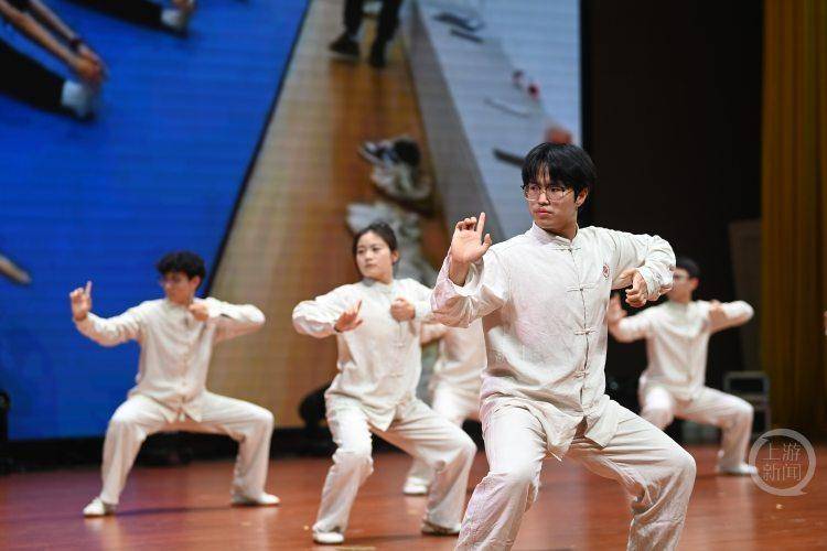 “春分时节,适当运动有助于气血流通、阳气舒展。中医养生功法讲究形与神俱、动静结合。”随着古朴的乐曲响起,针灸推拿学院、骨伤学院燕青门传承班的同学们,带来了八段锦和迷祖拳组合表演。一招一式,刚柔并济,在舒展筋骨间,真切感受到了春的生机与中医养生的精髓。