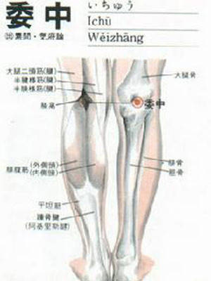 屈腿时,膝关节后侧也就是窝的位置出现横纹,而横纹的中点处即是委中穴。在针灸的"四总穴歌"里提到"腰背委中求",可见,委中是治疗腰背病症的要穴。