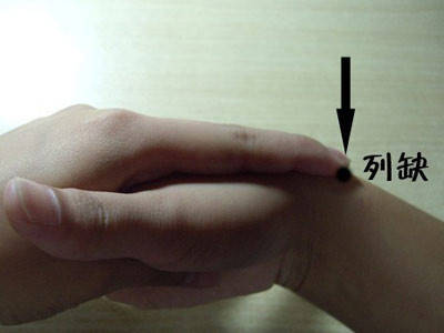 两手虎口交叉相握,这时左手食指是在右腕的背部,而食指尖下就是列缺穴。此穴位于三经交会处,因此不仅对于肺经,还对大肠经和任脉的经气都具有调节作用。