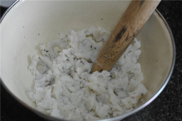 蒸熟的山药去皮,趁热用擀面杖擀成泥。