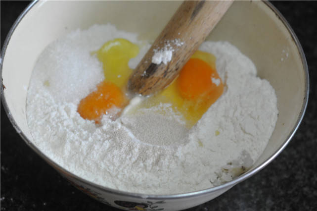 山药泥温热的时候,将面粉和糖,酵母粉,鸡蛋,油全都混合,用筷子搅拌均匀。