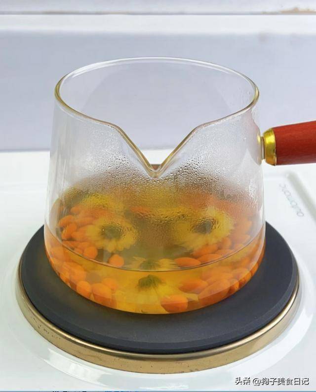 取几朵菊花,一小把枸杞,放入壶中,加水煮沸后转小火再煮五分钟。