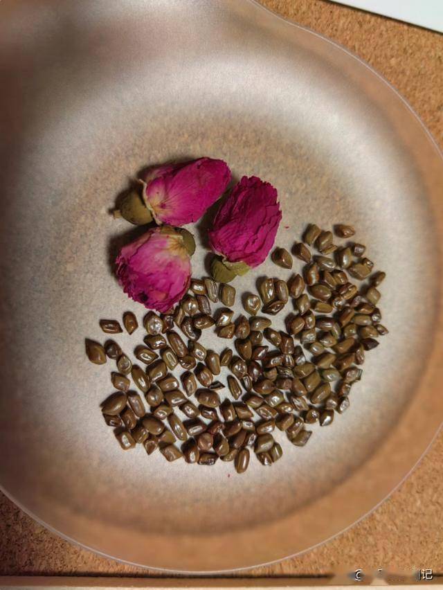 决明子炒过之后香气更浓,取一小撮,加上几朵干玫瑰花,一起放入锅中煮沸。