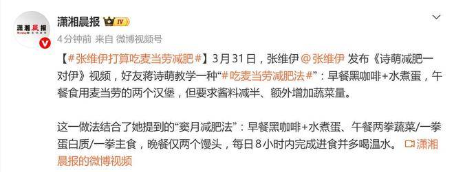据4月1日的报道,3月31日,演员张维伊发布了一则名为《诗萌减肥》的视频,迅速引发了网友们的广泛讨论。视频中,张维伊的好友蒋诗萌亲自演示了一种听起来颇为反常识的减肥方法——吃麦当劳减肥法。让人惊讶的是,这种方法的核心竟然是在午餐时吃两个麦当劳汉堡!这一幕立刻将减肥与快餐这对原本毫无关联的概念强行搭配,犹如把两位老冤家硬生生地凑在了一起。