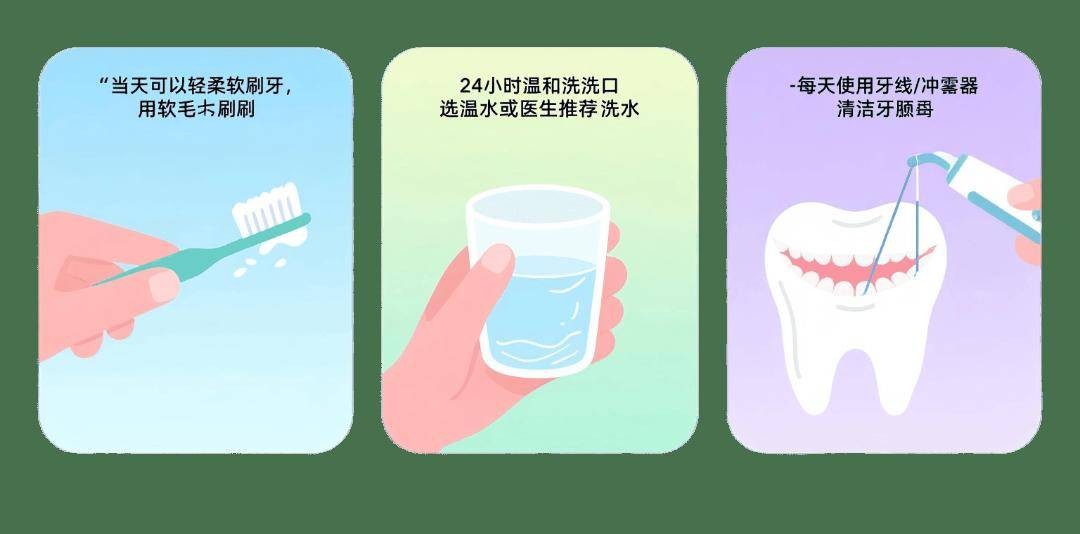 温和漱口:术后可正常漱口,但24小时内避免用力漱口,避免使用刺激性漱口水(如含酒精的)。建议使用温水或医生推荐的漱口水(如氯己定、西帕依鼓固龈液等漱口水等,需遵医嘱使用)。