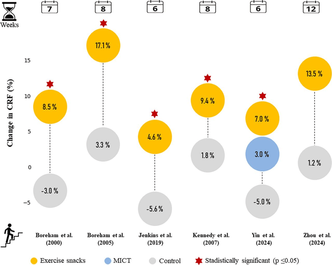 那么,「五分钟」可以练些什么?这篇荟萃分析中的一项研究,来自上海体育学院的殷明越团队(Yin et al., 2024)。该研究中的「碎片化运动组」每周进行 3 天训练,每次训练时间 30 秒,内容为 6 层(126 个台阶)的全力冲刺爬楼,持续 6 周。